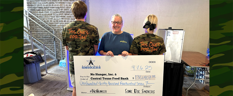 This One's For Jim! A big giant THANK YOU to everyone for your support of The Sine Die Smokers “Cooking For a Cause”. This year’s event was bittersweet, as we honored the memory of Jim Reaves, who we recently lost. Although heartbroken, we knew Jim would tell us to keep doing good and keep having fun. We stuck to that thought and came away with a very successfull result, raising $130,407 for No Hunger Inc. and the Central Texas Food Bank.