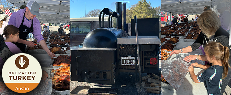 Operation Turkey - 2025 Operation Turkey is a 100% volunteer-powered organization dedicated to feeding and clothing the homeless and less fortunate in Austin and more than 20 cities nationwide. Over 40,000 volunteers work together to ensure everyone in need receives a warm Thanksgivng Day meal and a moment of kindness during the holiday. Volunteers work year-round to make this possible. IOU BBQ proudly took part in the cooking side of things on Thanksgiving eve. All efforts were focused on cooking over 1,000 turkeys. This year, Operation Turkey was able to assemble approximately 50,000 Thanksgiving Meals and deliver everything within just four hours on Thanksgiving Day.